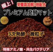 別途出品してある国産カブト用のノーマルの「ヒマラヤひらたけマット」を精密なマシーンでさらに微粒子に粉砕して幼虫が食べやすくしトレハロースやグルコース、キトサン、ローヤルゼリー、高活性グルテン、アルギニン、カルシウム、ミネラル、酵素、酵母菌、特殊アミノ酸などの栄養添加剤を贅沢に通常3倍配合した拘りの特選プレミアムマットです。