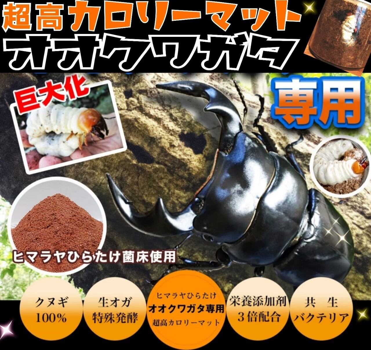 長年の研究からオオクワガタに最も有効であったクヌギのオガコを100%使用して作成した最高峰の新品の菌糸『ヒマラヤひらたけ』から仕上げた菌床発酵マットにオオクワガタ専用の栄養添加剤をたっぷり配合した超高カロリーマットです。